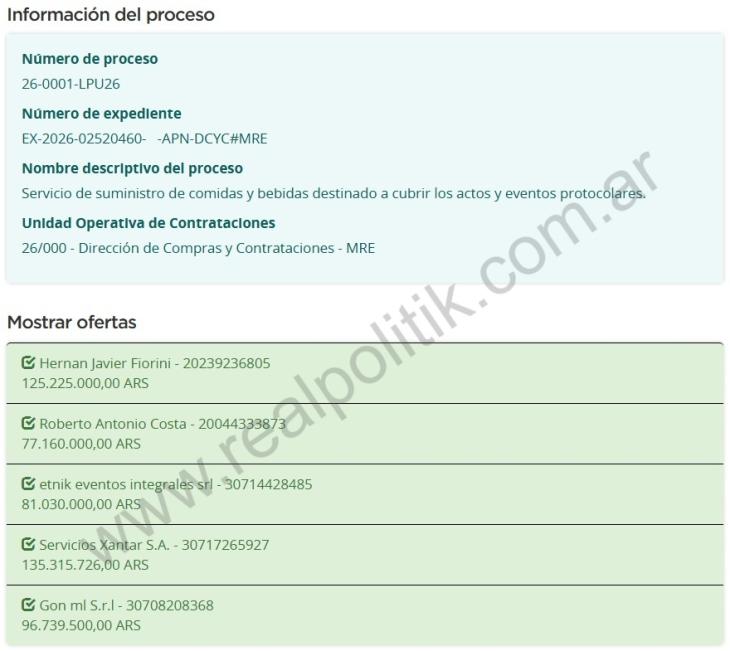 La compulsa fue abierta recientemente y recibió cinco ofertas: Hernán Javier Fiorini, Roberto Antonio Costa, Etnik Eventos Integrales SRL, Servicios Xantar SA y Gon ML SRL. Al menos dos de las propuestas superan los 100 millones de pesos, lo que deja entrever que el monto final podría ubicarse en el rango más alto previsto.