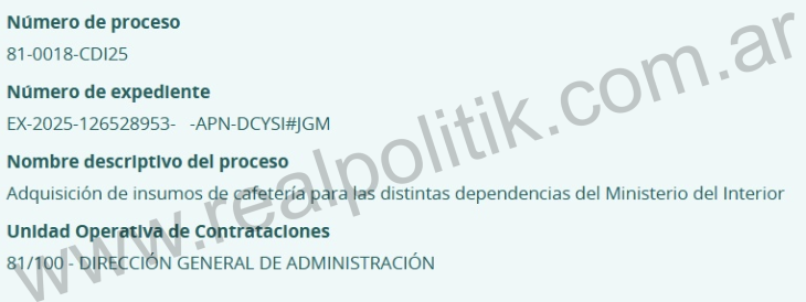 Ahora es el turno del ministerio del Interior, que impulsa el proceso de contratación directa 81-0018-CDI25 para la adquisición de “insumos de cafetería”. El expediente ya se encuentra disponible para adjudicar y contempla un desembolso estimado en al menos 6 millones de pesos.