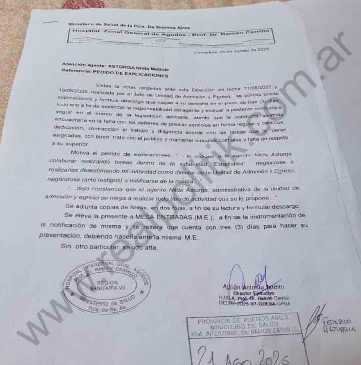 En paralelo, REALPOLITIK accedió al pedido de explicaciones que la dirección del hospital emitió contra Astorga el 20 de agosto de 2025, firmado por el director ejecutivo Adrián Tarditti.