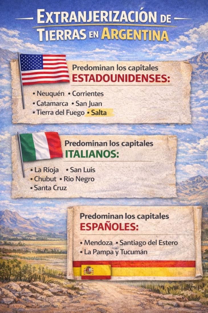 El mapa permite visualizar el nivel de extranjerización por departamento y la nacionalidad de los principales poseedores de tierras. "De las 13 millones de hectáreas en manos extranjeras la mitad pertenece a estadounidenses, españoles e italianos. Esto genera un problema de soberanía, porque el estado tiene dificultades para intervenir en propiedades privadas en zonas estratégicas, fronterizas o con recursos críticos", señaló.
