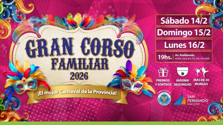Este sábado 14, domingo 15 y lunes 16 de febrero, San Fernando vuelve a vestirse de fiesta con una nueva edición del Gran Corso Familiar, considerado “el mejor Carnaval de la provincia”, con entrada libre y gratuita para todas las familias.