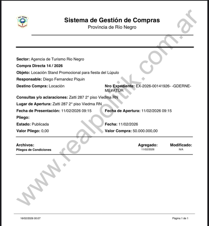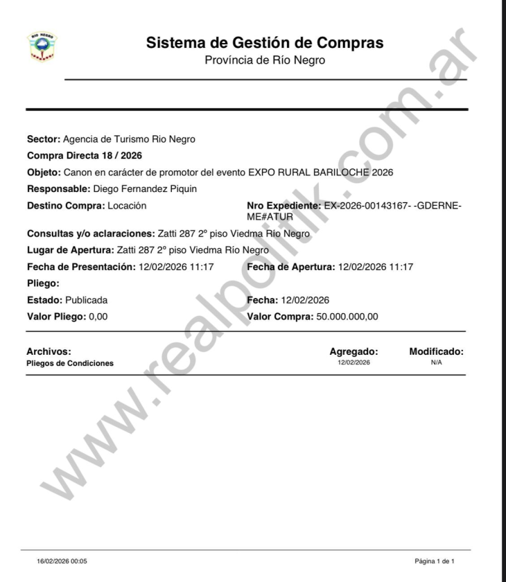 La misma modalidad se utilizó para destinar 50 millones de pesos a la Fiesta Nacional del Lúpulo y otros 50 millones de pesos para un stand en la Expo Rural Bariloche 2026, también bajo la figura de compra directa.