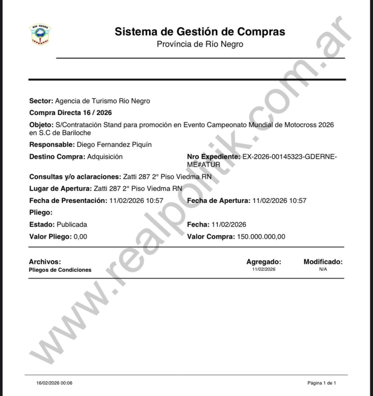 Según consta en el Sistema de Gestión de Compras de la provincia de Río Negro, la Agencia de Turismo autorizó una compra directa por 150 millones de pesos para la contratación de un stand promocional en el evento del Campeonato Mundial de Motocross 2026 que se desarrollará en San Carlos de Bariloche.