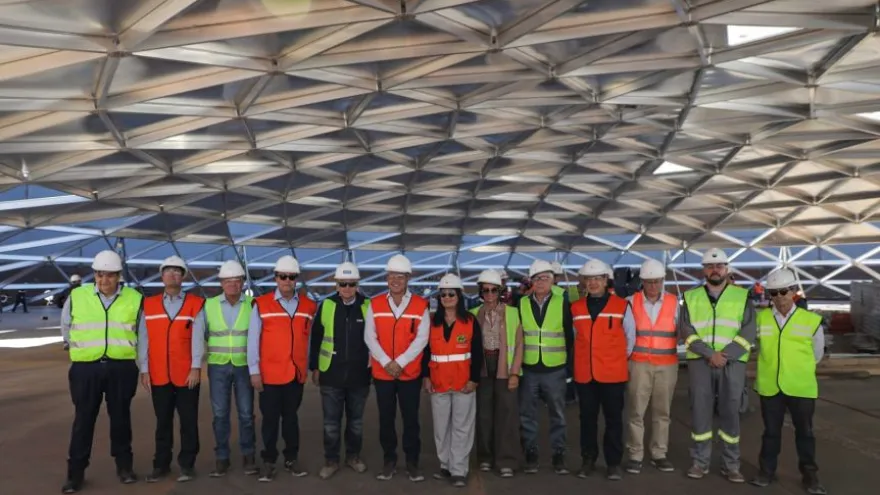 Durante la recorrida, las autoridades observaron el montaje de dos de los seis tanques de almacenamiento que conformarán la terminal. Las cifras explican la escala: