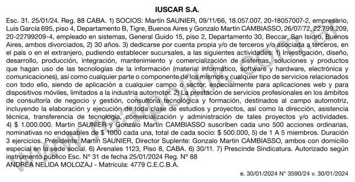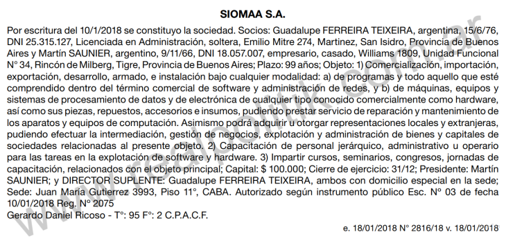 Lejos de ser una consultora independiente, SIOMAA SA es una sociedad anónima fundada por Martín Saunier y Guadalupe Ferreira Teixeira en 2018. Aunque Saunier todavía continúa vinculado a la empresa, su paquete accionario pertenecería mayormente a la Asociación de Concesionarios de Automotores de la República Argentina (ACARA).
