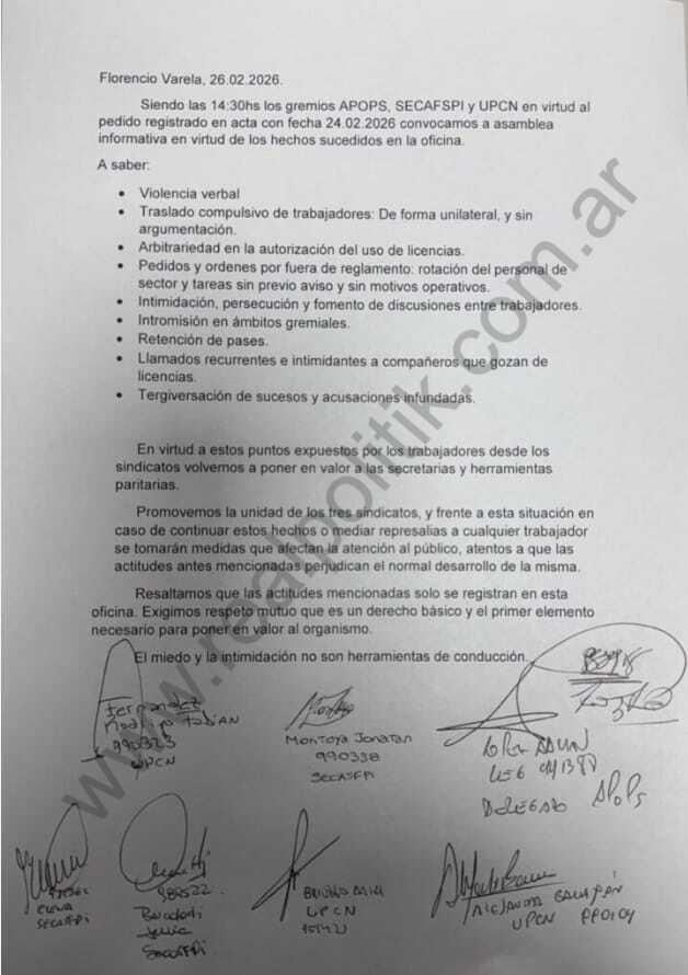 Según el documento fechado el 26 de febrero de 2026, al que accedió este medio, los gremios detallan una serie de prácticas que se repiten dentro de la oficina de ANSES Varela. Entre los puntos más graves denunciados se encuentran: