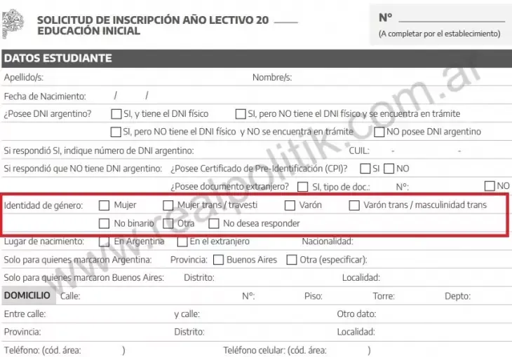 El gobierno de la provincia de Buenos Aires volvió a distribuir este año la planilla oficial de Solicitud de Inscripción desde Preescolar y Educación Primaria, un formulario que, entre otros datos personales y sanitarios, incluye un apartado específico para consignar la “identidad de género” en alumnos menores, a partir de los tres años de edad.