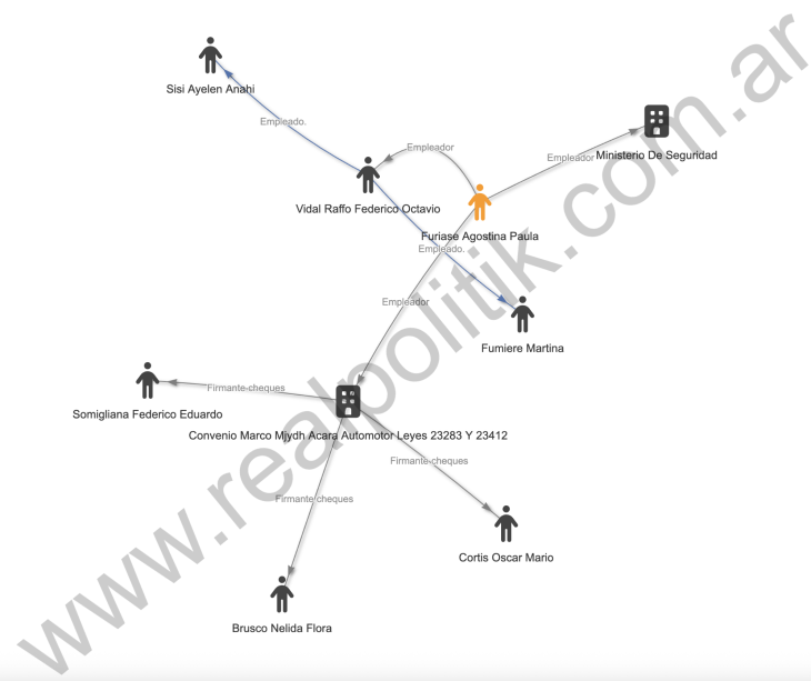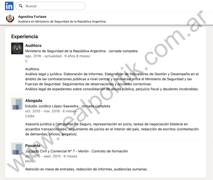 En su perfil de LinkedIn, Agostina Furiase asegura desempeñarse como auditora del ministerio de Seguridad desde agosto de 2016, en épocas en las que Mauricio Macri ejercía la primera magistratura del país. Sin embargo, registros oficiales ubican su ingreso al estado nacional hace poco más de un año. Previamente, percibió un sueldo a través de la Asociación de Concesionarios de Automotores de la República Argentina (ACARA) durante más de siete años, mediante el controvertido convenio marco con el ministerio de Justicia y Derechos Humanos.