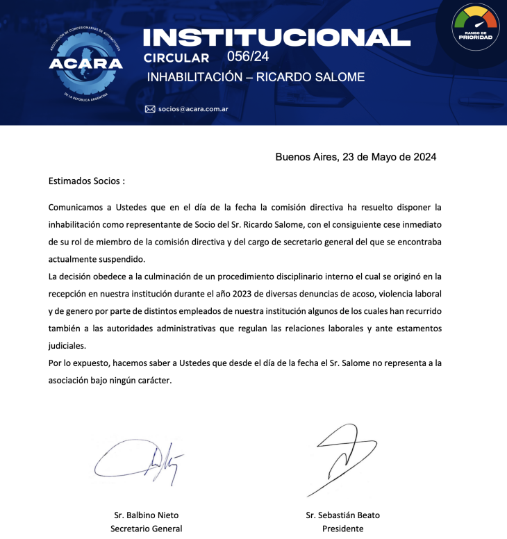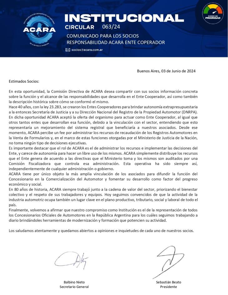 En el seno de la comisión directiva se sostuvo que el RUNA “no funciona”, que expone a los concesionarios y que la firma digital genera responsabilidad solidaria. Sin embargo, algunos empresarios manifestaron —en minoría— que preferían que el sistema tuviera éxito. Uno de ellos lo expresó abiertamente y, según relatan testigos, debió escuchar durante más de media hora argumentos en contra por parte de la conducción, sin que lograran refutarlo de manera convincente.