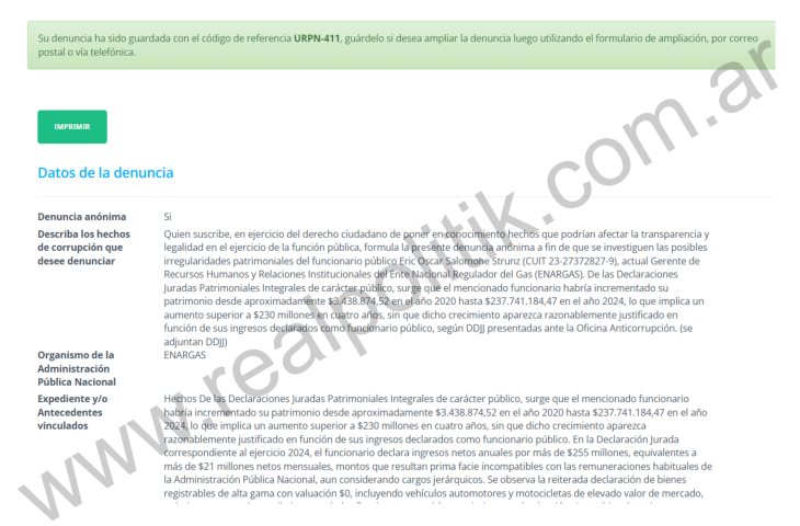 Una denuncia pide que se investigue al funcionario Eric Oscar Salomone Strunz, actual gerente de Recursos Humanos y Relaciones Institucionales del Ente Nacional Regulador del Gas (ENARGAS), por la presunta comisión del delito de enriquecimiento ilícito de funcionario público, tipificado en el artículo 268 inciso 2 del Código Penal.