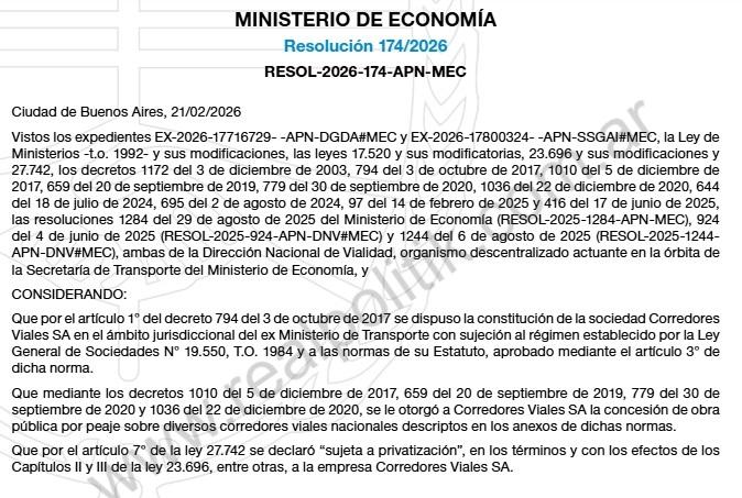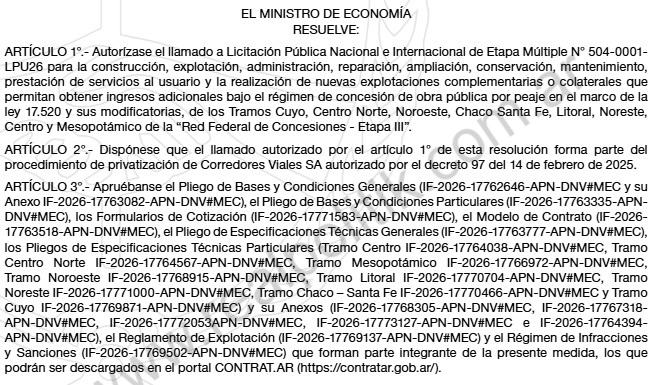 El conflicto se enmarca en el proceso de privatización del sistema vial que impulsa el gobierno de Javier Milei. A través de la resolución 174/2026 del ministerio de Economía, la administración libertaria lanzó licitaciones para concesionar distintos corredores estratégicos del país bajo el régimen de obra pública por peaje.
