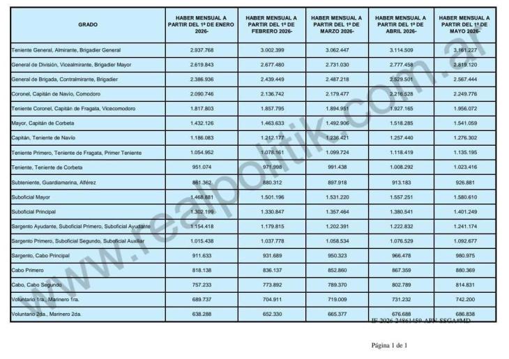 Veamos: según datos que relevó REALPOLITIK, el vicealmirante Juan Carlos Romay, a la cabeza de la conducción de la fuerza, cobrará en marzo de este año un salario de 3.062.447 pesos. Los sueldos van decreciendo de manera significativa a lo largo de todo el escalafón, como se observa en el gráfico de los salarios militares proyectados para los primeros meses de este año inflacionario, con un costo de vida que avanza al 3 por ciento mensual en promedio, hasta llegar a la base de la Armada compuesta por los marineros de 2ª, que cobrarán 638.288 pesos en marzo.