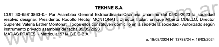 La adjudicación, formalizada el 18 de marzo, fue otorgada a la firma Tekhne SA, única oferente en el proceso, bajo la modalidad de contratación directa “por especialidad”. Se trata de la compañía que preside Rodolfo Héctor Montonati y dirigen Enrique Alberto Cuello y Valeria Esther Montonati.