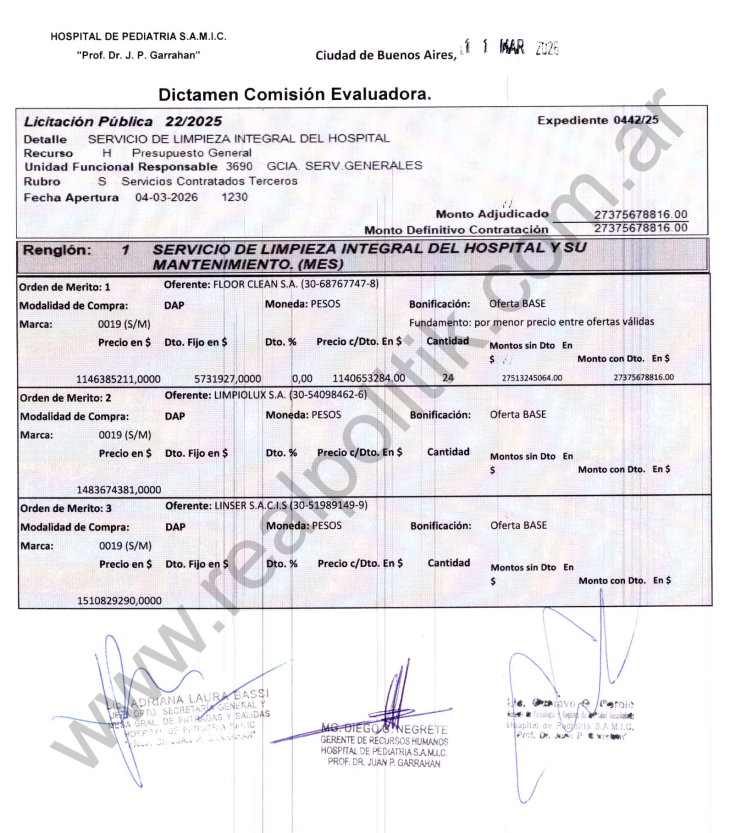 El documento al que accedió este medio indica que, pese al elevado monto ofertado por Floor Clean SA, su propuesta resultó la más baja entre las consideradas válidas, ubicándola en el primer orden de mérito por encima de Limpiolux SA y UNSER SACIS.