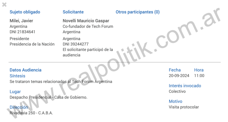 El primer movimiento es silencioso. El 20 de septiembre de 2024, Novelli entra a la Casa Rosada y se reúne a solas con el presidente. No hay otros funcionarios. No hay ruido. El motivo formal habla de “Tech Forum Argentina”, pero lo sustancial es otra cosa: el acceso directo. Sin filtros. Sin intermediarios.