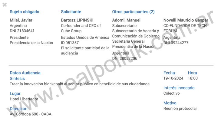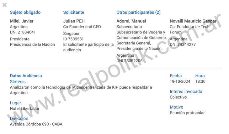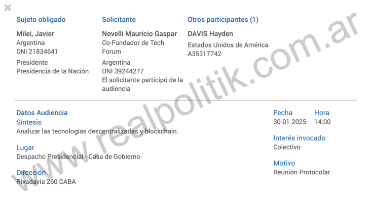 Y no se trata de reuniones cualquiera. Aunque figuren como “protocolares”, lo que se discute es específico, especializado y alineado con un universo que hoy está bajo sospecha: blockchain, inteligencia artificial descentralizada, arquitectura tecnológica vinculada al mundo cripto. Lo que muestran esos registros no es una visita de cortesía. Es una agenda.