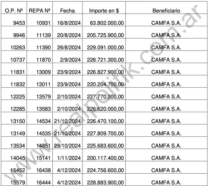 La adjudicación se dividió entre dos proveedores. Por un lado, CAMFA SA (Carnes CAMFA), que recibió más de 3.336 millones para la entrega de 183 mil kilos de roast beef y más de 300 mil kilos de pollo. La empresa es presidida Carlos Amado Omar y cuenta en su directorio a Maximiliano Omar, Facundo Omar y Lucia Clara Bianucci. Por otro, Transporte de Carga Berisso SA, con 1.587 millones por 138 mil kilos de carne de cerdo en distintos cortes.