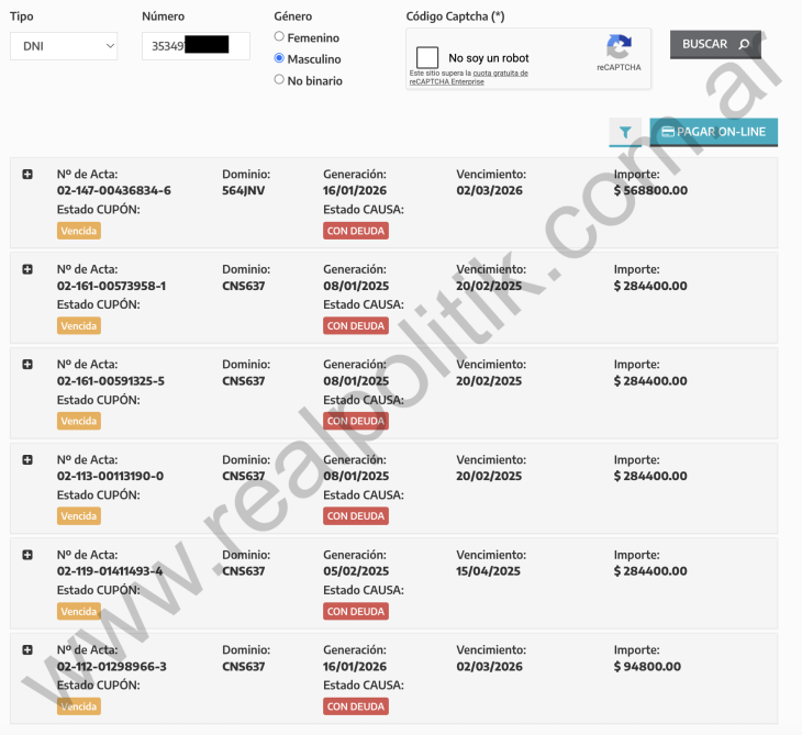 A la par del choque, el DNI de Agustín Romo aparece asociado en bases bonaerenses a casi 2 millones de pesos en infracciones impagas. Las actas —todas vencidas— se vinculan a dos dominios: uno corresponde a un vehículo oficial y otro a un Toyota Corolla GLI 1.6 patente CNS637, que figura a nombre de una particular, Natalia Domínguez, y a la firma Bernardiner SRL.