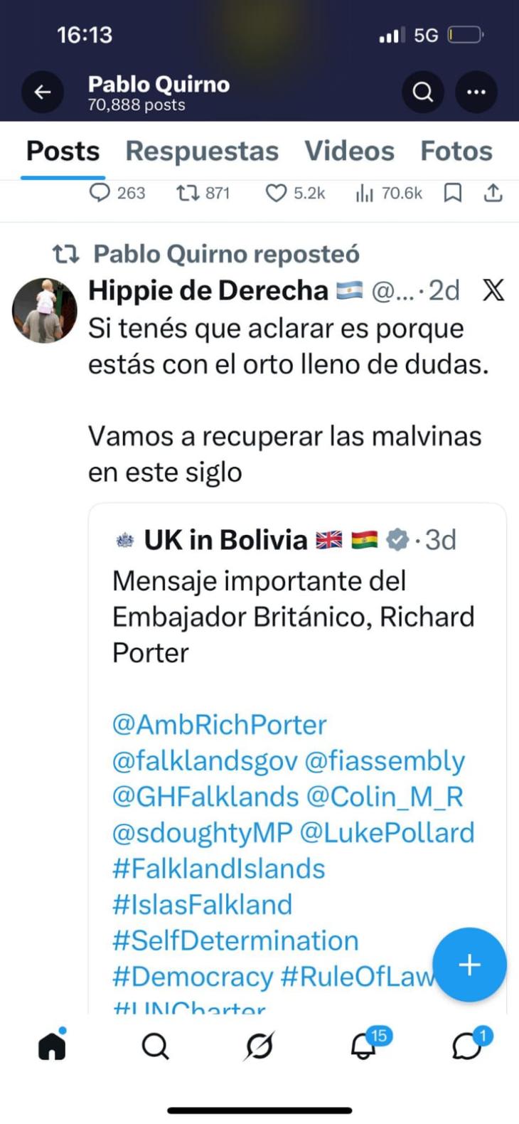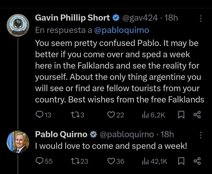 Uno de los cruces más comentados fue con una cuenta que se presenta como residente en las islas, quien invitó al canciller a visitar el territorio para “conocer la realidad”. Lejos de ignorar el mensaje, Quirno respondió que le “encantaría” viajar, lo que fue interpretado por distintos sectores como una señal inconveniente en términos diplomáticos. El intercambio continuó con comentarios irónicos sobre la existencia de vuelos comerciales y referencias a la supuesta condición de “turistas” de los argentinos en el archipiélago.