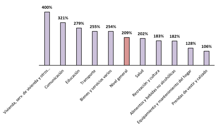 A este rubro le siguieron Comunicaciones, con una suba acumulada del 321 por ciento (+122 respecto al nivel general); Educación, con un incremento del 279 por ciento (+79); y Transporte, con una variación acumulada del 255 por ciento (+46). En el extremo opuesto, los rubros que exhibieron los menores incrementos acumulados de precios fueron Alimentos y bebidas no alcohólicas, con una suba del 182 por ciento; Equipamiento y mantenimiento del hogar, con una inflación acumulada del 128 por ciento; y Prendas de vestir y calzado, con un incremento del 106 por ciento.
