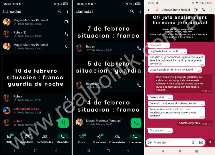 Uno de los puntos más delicados es la sistematicidad de los contactos fuera de horario. “Se han registrado en forma reiterada comunicaciones y llamados por parte de la jefa de Unidad… fuera del horario de servicio”. Las capturas de pantalla incorporadas en la denuncia muestran llamados insistentes y pedidos de entrega de material incluso en momentos personales.