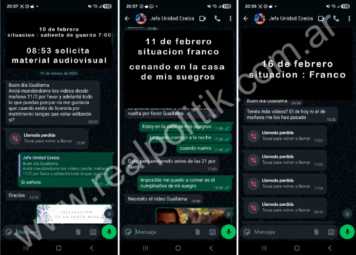 En uno de los chats, la jefatura exige: “Necesito el video, Guallama”; mientras el efectivo se encontraba en una reunión familiar durante su franco.