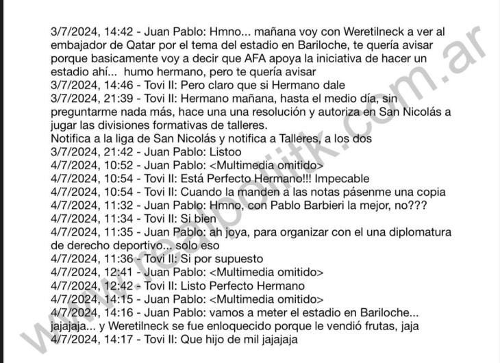 En ese marco, según publicaciones del medio LPO, se difundieron chats atribuidos a dirigentes como Pablo Toviggino y Juan Pablo Beacon, en los que se hacía referencia a vínculos con inversores qataríes interesados en desarrollar proyectos en Bariloche, incluyendo la posible construcción de un estadio. Si bien estos intercambios no tuvieron confirmación oficial, su circulación pública alimentó las versiones sobre la presencia de capitales extranjeros en iniciativas de alto impacto.