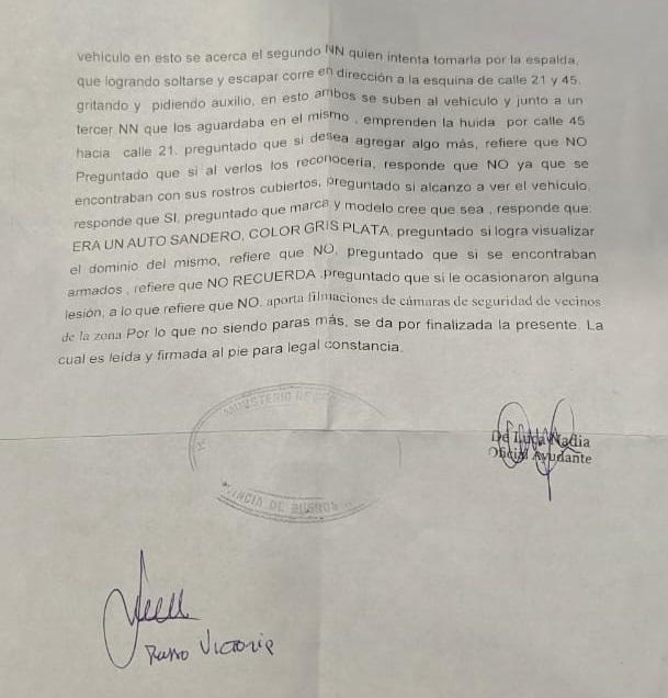 Fui abordada por tres hombres con el rostro cubierto, quienes actuaron de manera coordinada. Se trató de una situación de absoluta desigualdad: tres hombres contra una mujer sola. La situación escaló rápidamente a gritos y forcejeos, generando un escenario de extremo peligro. Tal como puede observarse en los videos de seguridad, logré escapar corriendo luego de varios segundos de tensión y desesperación.