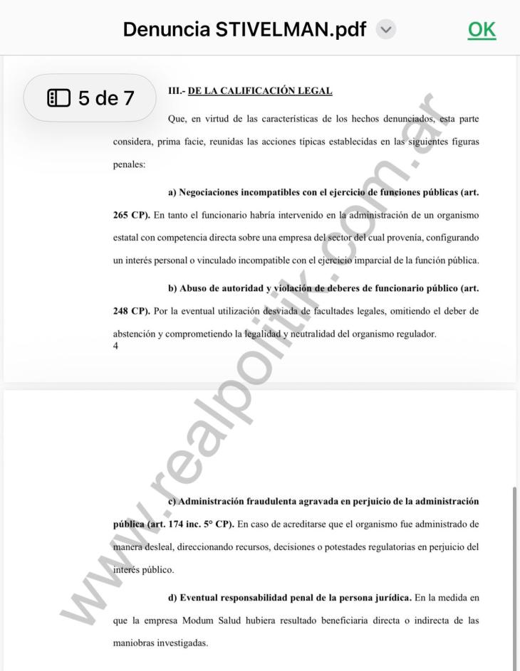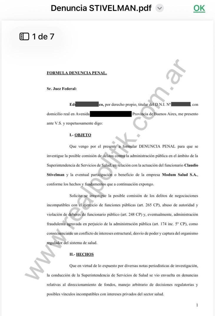 El borrador de la denuncia señala que Mujico habría tenido participación previa en empresas del sector privado de la salud, particularmente en la firma Modum SA, y mantendría además un vínculo directo con Stivelman. Esta combinación —antecedentes empresariales, funciones estratégicas y relaciones personales— es interpretada como un posible indicio de conflicto de intereses que debería ser investigado por la Justicia.